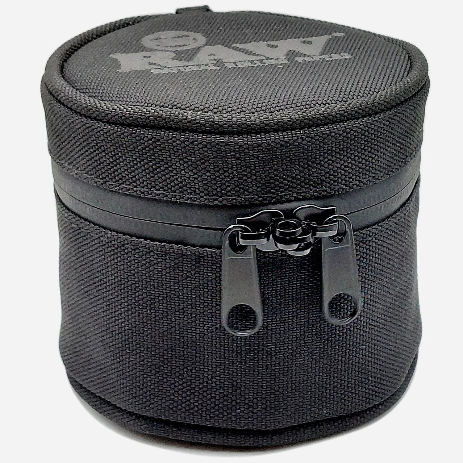 Raw Smell Proof Cozy in black with dual zipper, designed to discreetly store the 10 oz glass jar for odor-free storage.