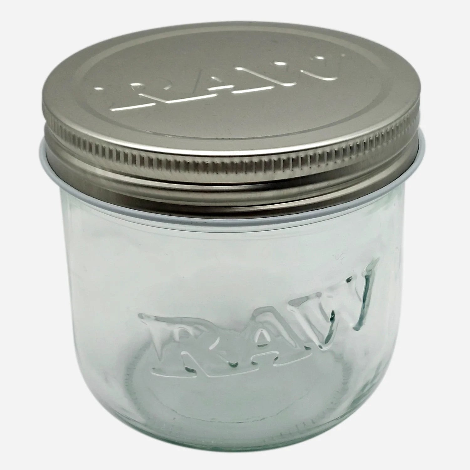 10 oz RAW glass jar with embossed logo and metal screw-on lid, ideal for airtight and smell-proof storage of herbs or contents.